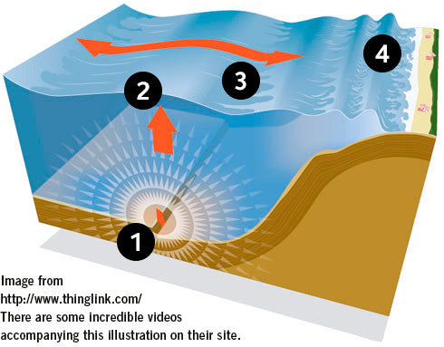 First, the sea bottom (Tectonic Plates) erupts. Next, the tectonic plates split or overlap, and pushing upward, cause the water above the split or overlap to rise in volume. Then, the water comes together to rise above the surface. At first the wave is not noticeable. Finally, the wave grows in height as it approaches the shallower waters of the shore...